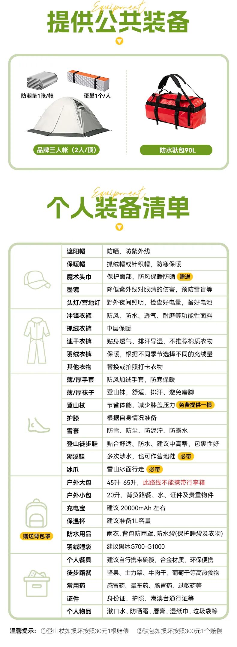 ● 驮运:包含所有装备驮运费用。(每人限重15KG,如超重每公斤200元,依次叠加)。