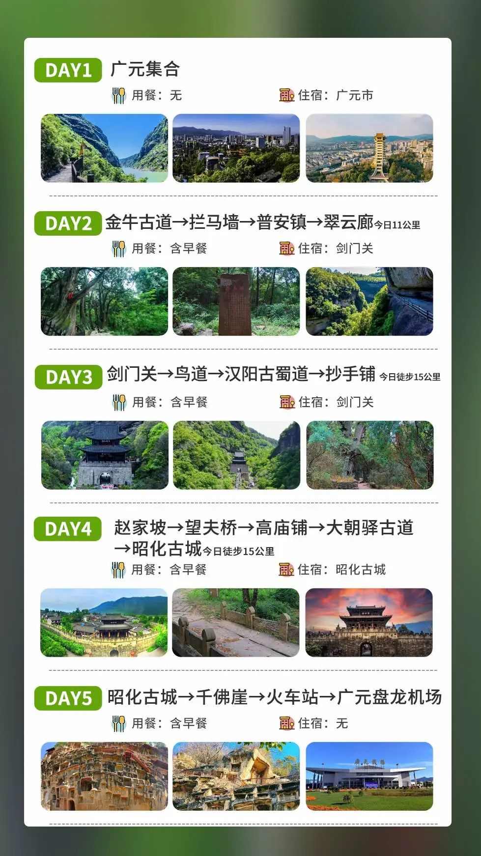 温馨提示:广元返程火车买3点以后(包含3点)广元返程飞机买3.30分以后)。走完广元川蜀古道,仿佛从泛黄的史书里抽身,却又把千年风雨收进行囊。那些被马蹄磨亮的青石板、在时光中站成雕塑的古柏、崖壁上斑驳的佛龛,都在无声诉说着“蜀道难,难于上青天”的苍茫,也见证着人类以脚步丈量天地的勇气。