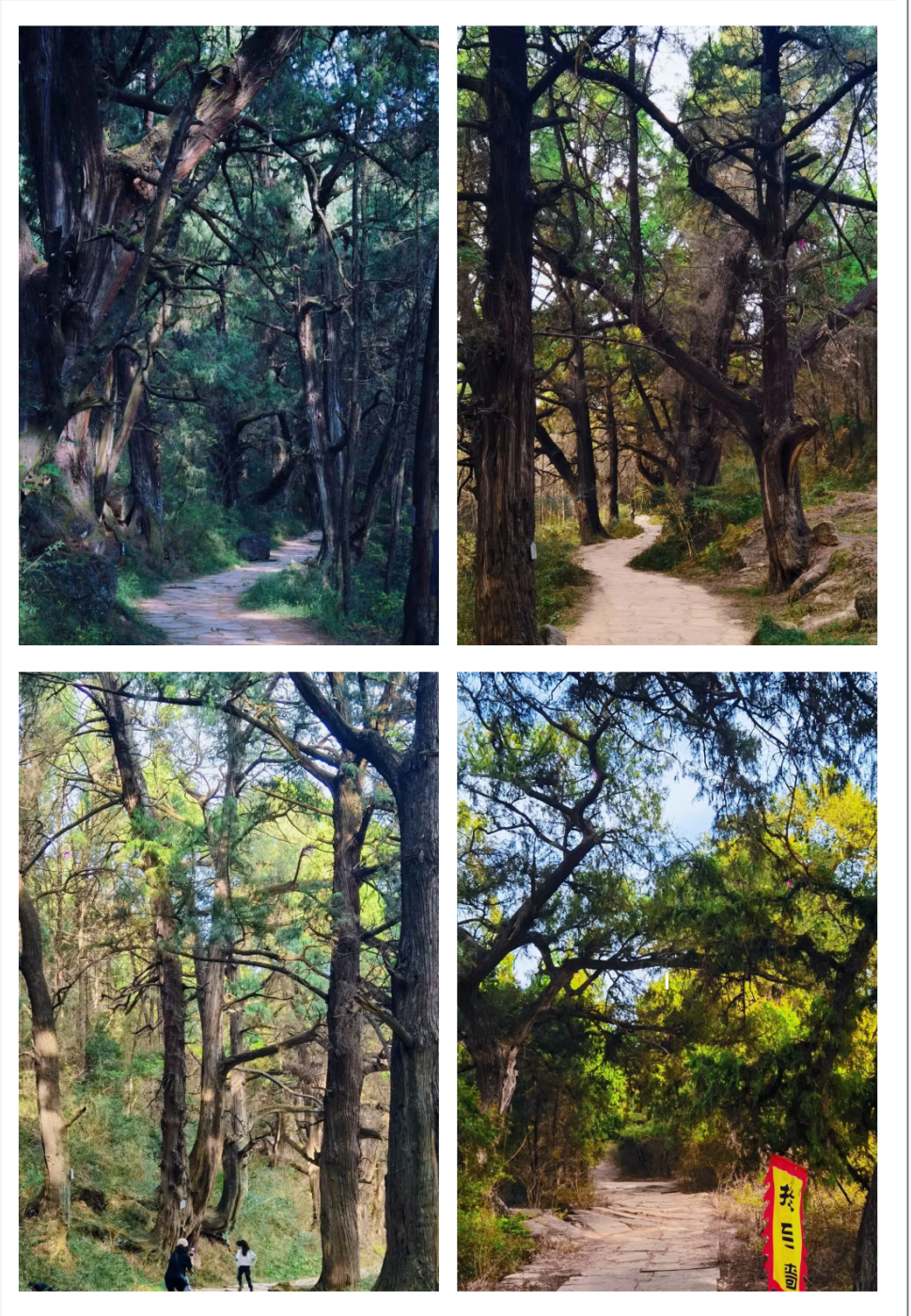 望夫柏:一株古柏倾斜向古道,宛如妇人远眺,民间传为妻子盼丈夫归乡所化;