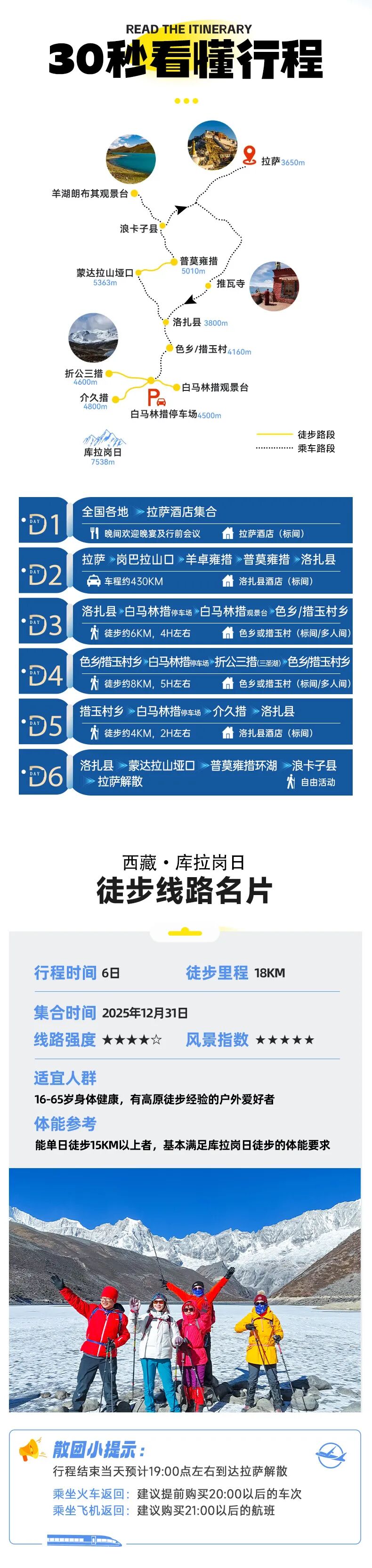 1.全程徒步约18公里,徒步平均海拔为4700米左右,徒步最高海拔为折公措垭口5000米左右,坐车最高海拔为蒙达拉山口5363米,住宿最高海拔为洛扎4000米左右。2.一月属于冬季,天气稳定,偶尔下雪,是看日照金山和星空最佳的时候,同时沿途的湖泊会结冰,也是看蓝冰的时候。