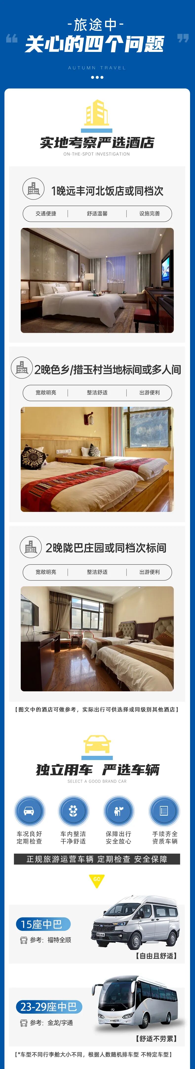 行程中的所列的酒店类型,2星/2钻=经济型;3星/3钻=舒适型;4星/4钻=高档型;5星/5钻=豪华型;意为评定或条件到达相应标准的酒店,少部分地区,由于政策等因素,可能存在酒店条件满足,但未进行星钻评定的情况。