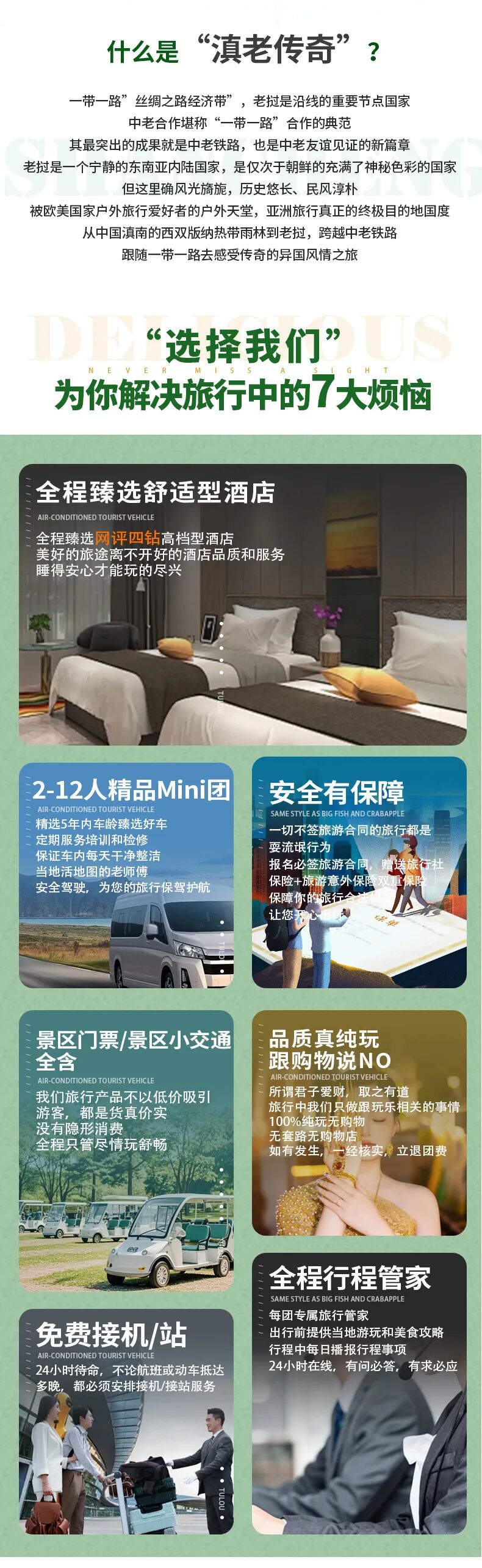 温馨提示:由于中老跨国铁路存在不确定因素,有可能动车时间调整/停运/无票,出现此类情况,我司在景点不减少的前提下,会对景点先后顺序和目的地住宿作出调整,敬请知悉并支持。