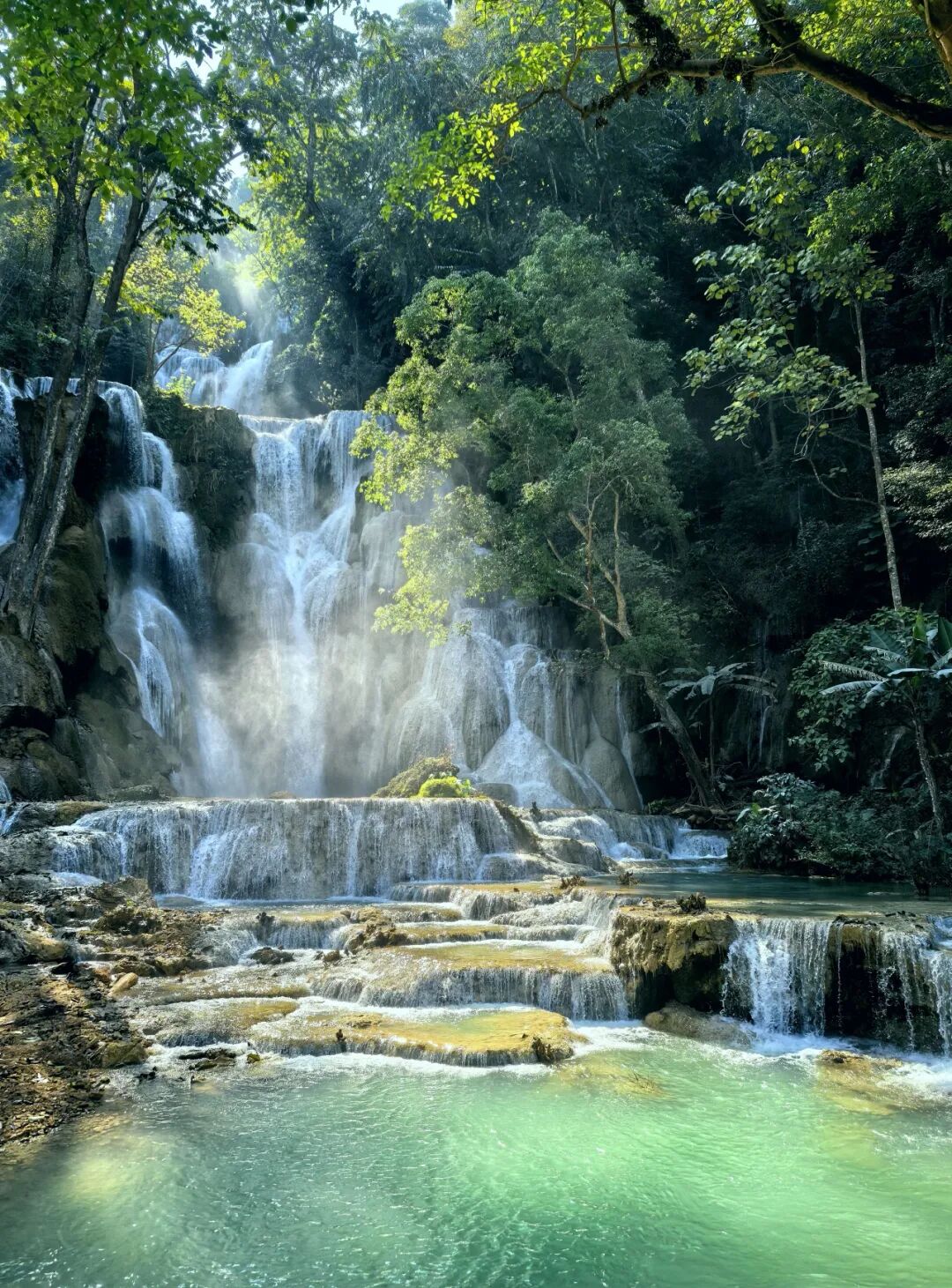 午餐后前往久负盛名的【光西瀑布】,有老挝“棉花堡”之称,光西瀑布因其喀斯特地貌的原因,使得山泉水如海水一样湛蓝,其中有一处高约 200 多米的瀑布直泻而下,相当壮观。站在瀑布前,清凉的水珠扑面而来,仿佛心灵也受到了荡涤。喜欢玩水的朋友,一定要带上游泳衣或比基尼,在这里和外国友人一起感受世外桃源,体验跳水及森林泳池乐趣。