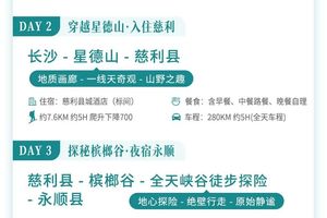 早餐后从长沙乘车约3.5小时前往星德山。徒步穿越经典小环线,沿途欣赏奇特峰林、一线天等景观,中午路餐,徒步约5小时。下午乘车入住慈利县城酒店。