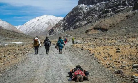 今天是最考验意志和体力的一天,早上5点就要出发,经过天葬台,满山坡都是衣服和布条覆盖的玛尼堆,然后爬高762米,到达整个转山路途中的海拔5630米卓玛拉山口,稍作休息,吃点东西,然后开始沿陡峭的碎石小道下山。
