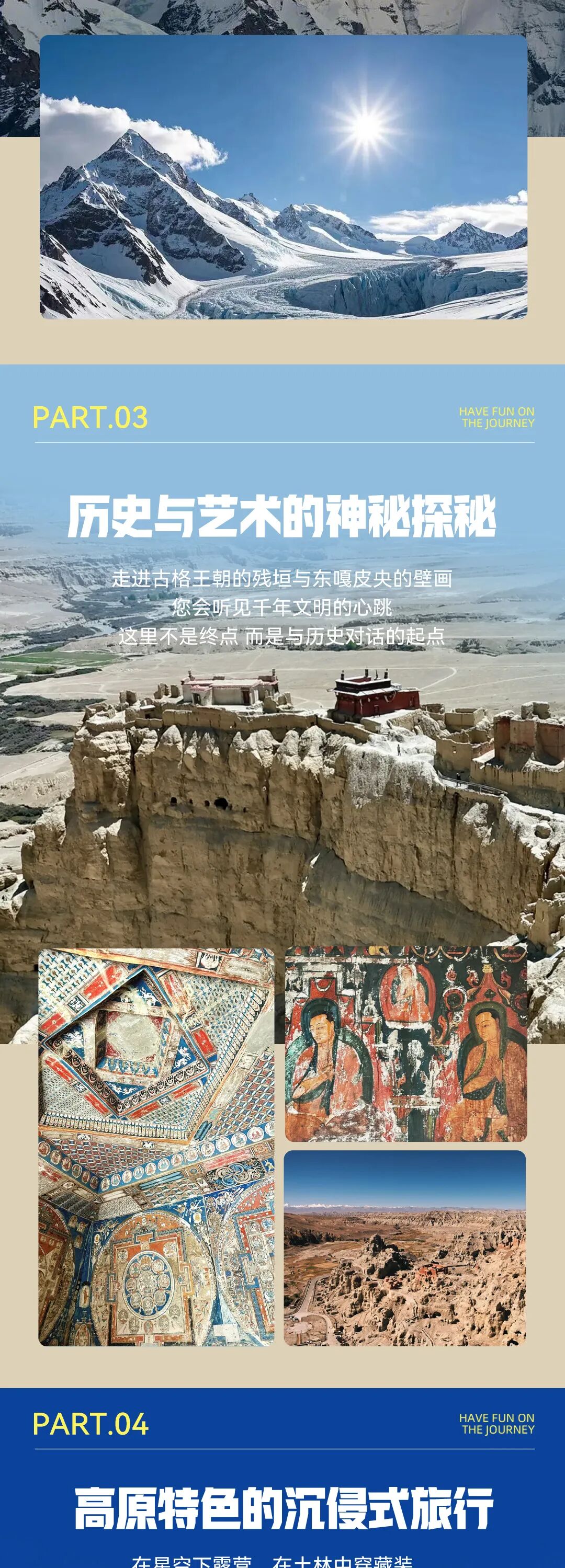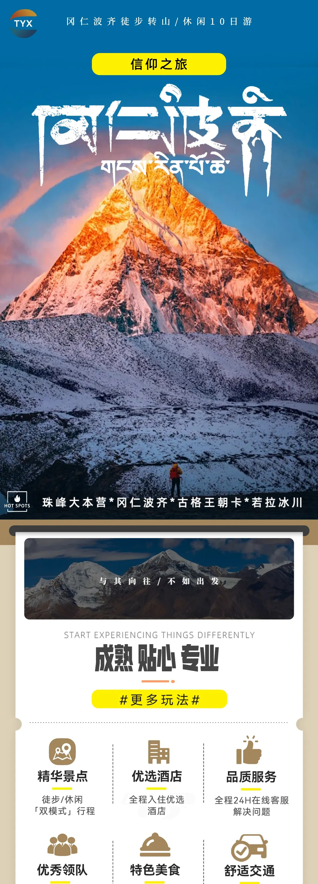 3、行程所含景点首道大门票(珠峰大本营门票160元+观光车120元、冈仁波齐门票150元或古格王朝门票65元+观光车30元、卡若拉冰川门票50元)