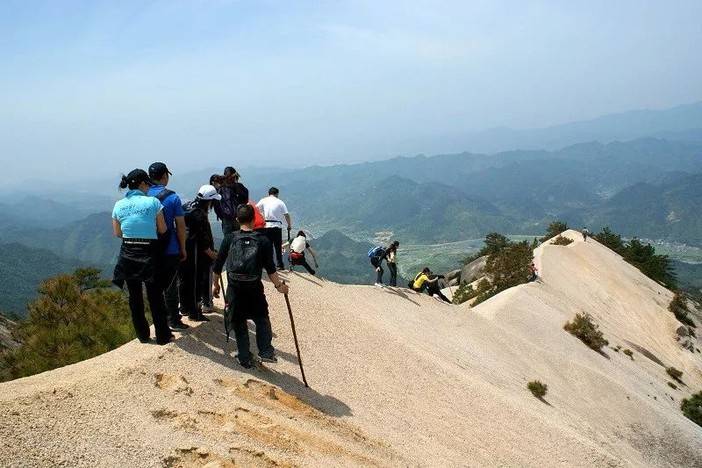 龙须山是一座沙化了的山,山脊上窄的地方只能容下一只脚,两边便是悬崖。山脊上的岩石基本都风化成了砂石和白沙,有的地方比较滑。山体有一处小断崖,还有几处路是在悬崖上贴壁经过,4、5米高,站在山顶可以清晰地看到有清凉峰、障山大峡谷等景色。山脊上有的地方有点象黄山的鲫鱼背,两边是悬崖。