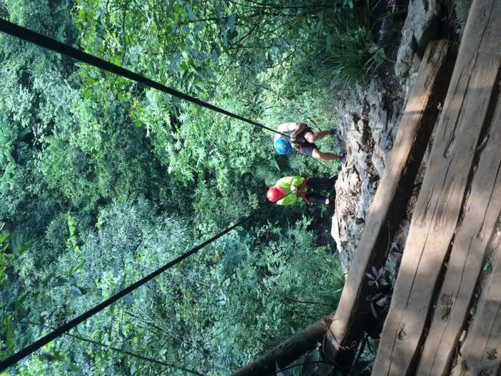 纪龙山拥有30/80米悬崖速降,不需要特殊的技术,也不需要多大的力量,但必须克服对高度、速度的恐惧,具备勇往直前、坚持到底的决心,还需要同伴的鼓励保护。